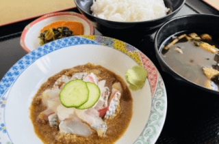 新鮮な玄界灘の魚を特製の濃厚なごまだれに絡めてご飯に載せ、薬味とともに熱いお出汁をかけていただきます。新鮮な魚と風味豊かなごまだれ、そして熱々のお出汁が三位一体となり宗像ならではの贅沢な味わいを楽しめます。
