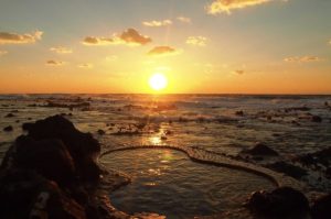 黄金崎の海辺露天風呂から眺める日本海の夕日は、強塩泉による保温効果とあわせて、訪れる人々に感動を与えます。