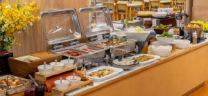 旅館部では栄養バランスの取れた日替わりメニューをビュッフェ形式で提供し、健康的な滞在をサポート。