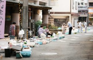早朝、下駄の音が響く温泉街には四ヶ村地区の農家のお母さんたちが集まり、採れたての山菜や野菜、きのこ、笹巻き、しそ巻きなど地元の味覚がずらりと並びます。