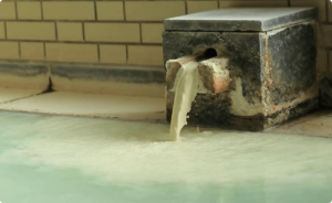 源泉を管理する「湯守」によって毎週行われる「湯花流し」では、湯樋に付着した湯花を流し落とすことで温泉が乳白色に変化。