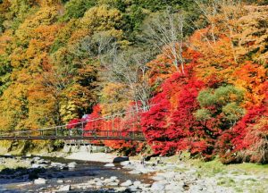 特に秋、渓谷を赤や黄色に染め上げる紅葉の美しさは格別。