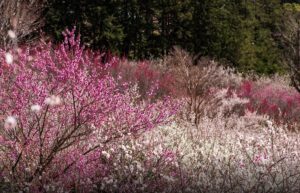 約4,000本の紅梅と白梅が2月上旬から3月上旬にかけて見頃を迎え、山全体が淡いピンク色に染まる光景は圧巻の美しさです。