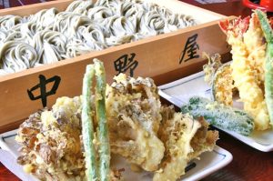 布海苔をつなぎに使ったそばは強いコシが特徴で、へぎと呼ばれる木製の器に美しく盛り付けられます。