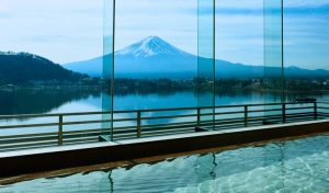 河口湖旅館「うぶや」は大風呂の正面に富士山と河口湖が広がり、風景にとけこむような感覚を味わえる温泉が自慢です。