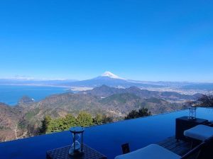 昼は富士の稜線がくっきりと浮かび、青さの濃淡が湯のきらめきに重なります。夕暮れには空の色が湯に映って、まるで湯そのものが茜に染まるように見えます。