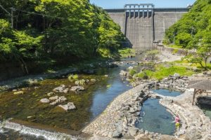 ダム直下の河原に湧く大露天風呂「砂湯」から、山あいの静けさに包まれる真賀温泉館へ。