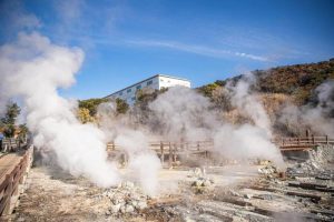白い湯気が立ちのぼる山の懐、雲仙温泉は長崎県雲仙市、島原半島の中央部に広がる火山の温泉地です。