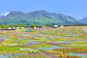長湯温泉から車でほど近い高原に広がるくじゅう花公園は、阿蘇くじゅう国立公園内の雄大な自然を背景に季節ごとの花が静かに咲きそろう場所です。