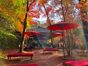新緑の頃は六甲の稜線がくっきりして外気浴が気持ちよく、湯から上がっても足取りが軽くなります。秋は紅葉が石畳の影を濃くし、金泉の色と相まってまるで絵の具を溶いたような景色です。