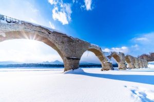 そして冬、湖が凍結すると白一色の世界の中に橋梁のアーチが現れ、時間が止まったかのような静寂に包まれます。