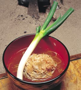 箸の代わりに一本の長ねぎを使ってそばを食べる独特のスタイルは見た目のインパクトだけでなく、ねぎの香りとそばの風味が重なり合う素朴な味わいが魅力です。