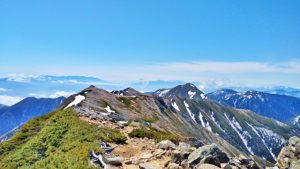山頂付近から望む槍・穂高連峰の眺めは雄大で、晴れた日には空と岩稜が溶け合うような景色が広がります。