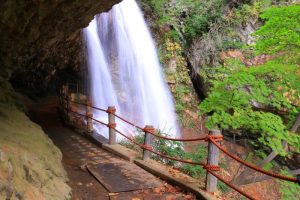 雷鳴のような水音とともに流れ落ち、その裏側を歩ける「裏見の滝」として知られています。