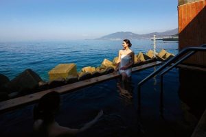 湯船に身を沈めると、潮の香りを含んだ風とともに、やわらかな熱が体を包み込みます。
