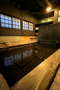 筋湯温泉の共同浴場のひとつ「薬師湯」は、檜造りの内湯が特徴の落ち着いた一湯です。