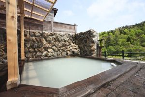 シンボルの混浴野天風呂には、桝・樽・岩の3つの湯船が並び、屋根のない空の下、噴気の音を聞きながら湯に身をゆだねる感覚は、ここにしかないものです。