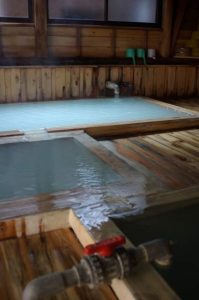 館内の浴槽には新鮮な温泉が絶えず注がれ、白濁の湯が静かに満ちていく光景が印象的。
