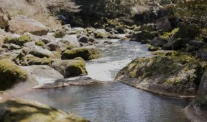露天風呂では川の流れや森の気配を間近に感じながら、源泉かけ流しの湯に浸かることができます。
