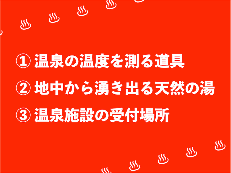 正解は、「 ② 地中から湧き出る天然の湯 」でした。