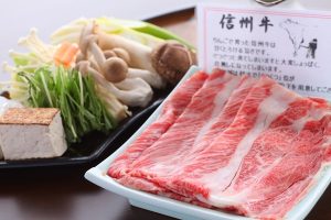 信州牛は、清らかな水と豊かな自然の中でゆっくりと育てられた長野県産の黒毛和牛です。口の中でとろけるような霜降りの旨みは格別で、宿の夕食会席や地元の食事処で、さまざまな調理法で味わえます。
