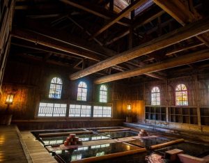 法師温泉・長寿館。鹿鳴館風の大窓を持つ明治28年(1895年)建築の大浴場「法師乃湯」は、浴槽の底に敷かれた玉砂利の隙間から源泉が自然湧出する、日本でも極めて希少な「足元湧出温泉」です。